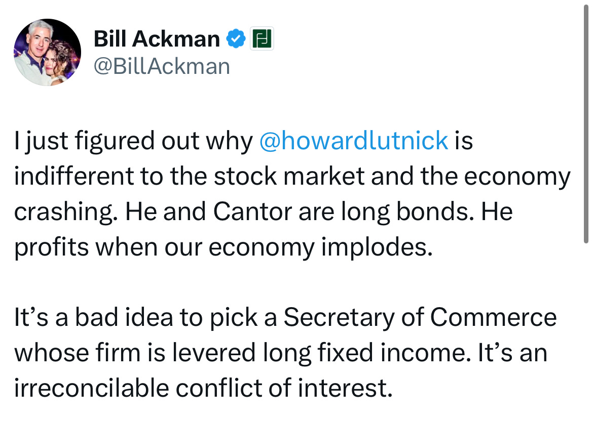 Trump’s betting that after 15 days of chaos, markets will be begging for order. So will our trading partners. And as Bessent said in his interview, it’s not about the countries like Vietnam doing a deal, it’s the companies like Nike that offshored business there. Oh, yeah, and Ackman is very long Nike (11% if the fund and $1.2 billion of exposure … reminds me of his Hilton position in 2020).